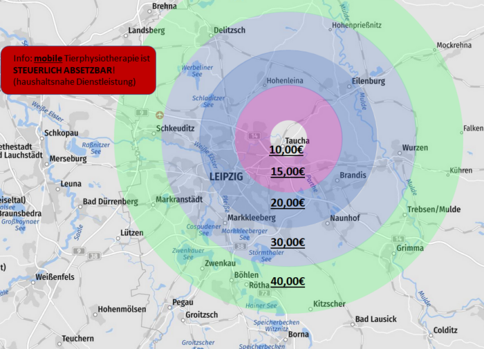 Physiotherapie ist eine unterstützende Maßnahme, die individuell an die Bedürfnisse Ihres Tieres angepasst wird. Der Zeit- und Arbeitsaufwand richtet sich nach medizinischer Diagnose, der aktuellen Befindlichkeit und der Genesungsgeschwindigkeit des Patienten. In der Medizin gibt es leider keine Tabellen, an denen abgelesen werden kann, wie lange eine Behandlung dauern wird. Gerne erarbeite ich nach der Erstvorstellung einen Therapievorschlag mit dem voraussichtlichen Behandlungs- und Kostenplan. Im Durchschnitt werden 4-6 Sitzungen fällig.